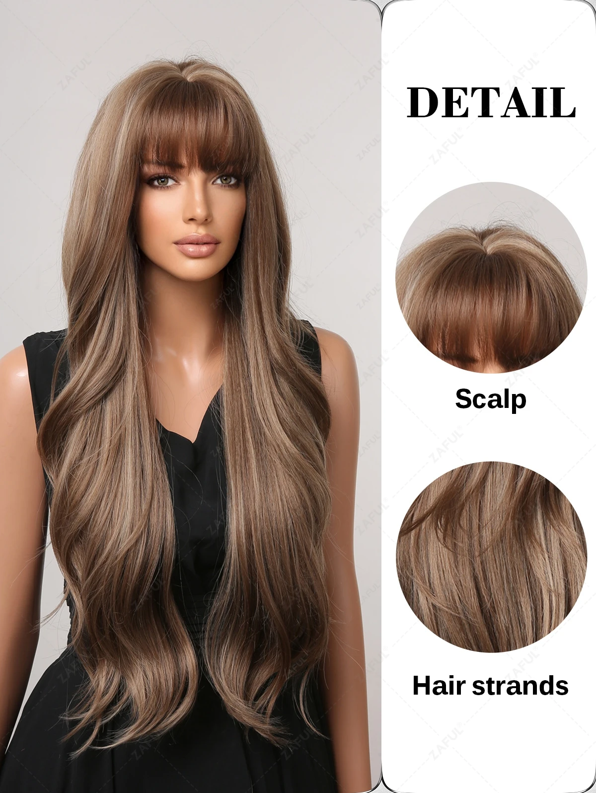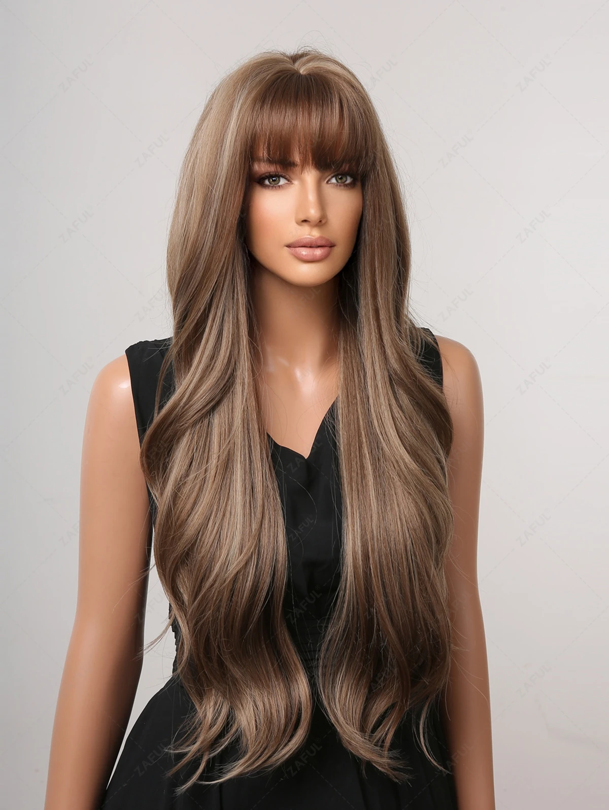 See-through Bangs Brown Gradient Light Brown Long Wavy Synthetic Wig