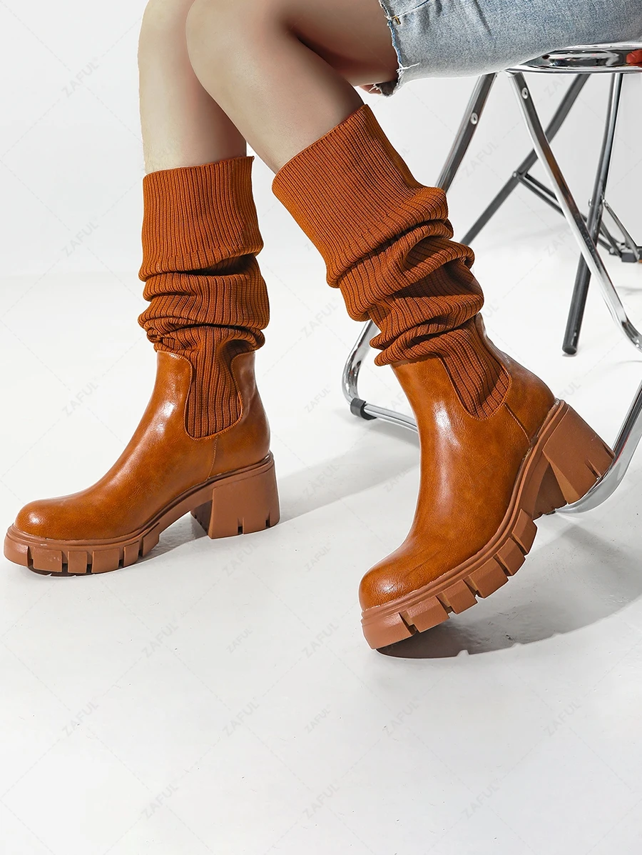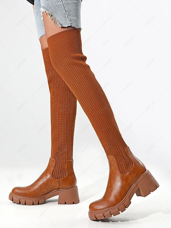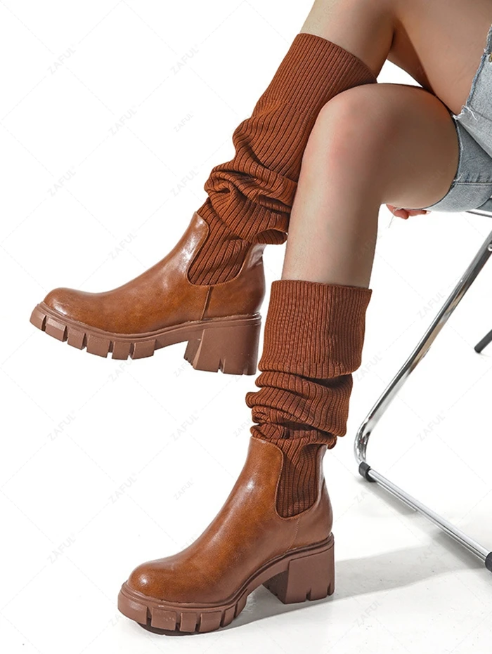 Women’s British Style Solid Color Over-the-knee Length Chunky Heel Stretchy Knitted Sock Boots