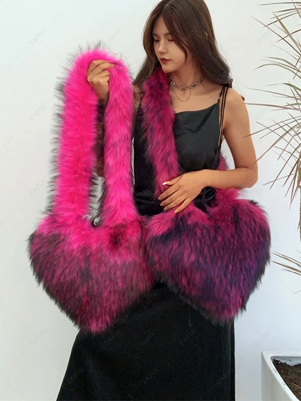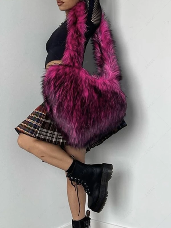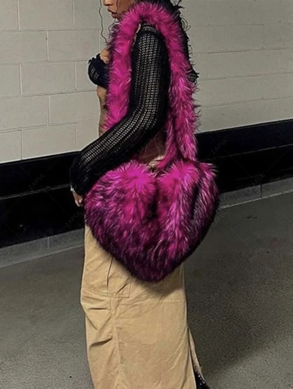 Women’s Y2K Statement Oversized Heart Shaped Faux Fur Fluffy Crossbody Shoulder Bag