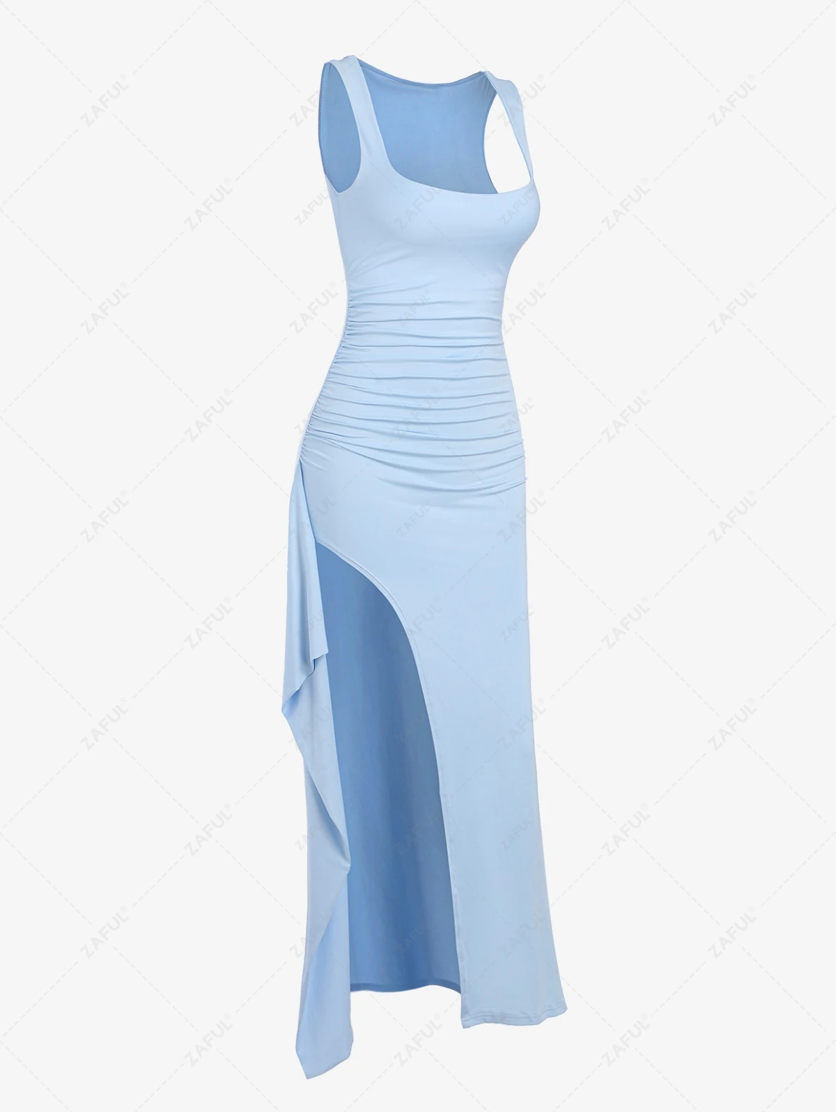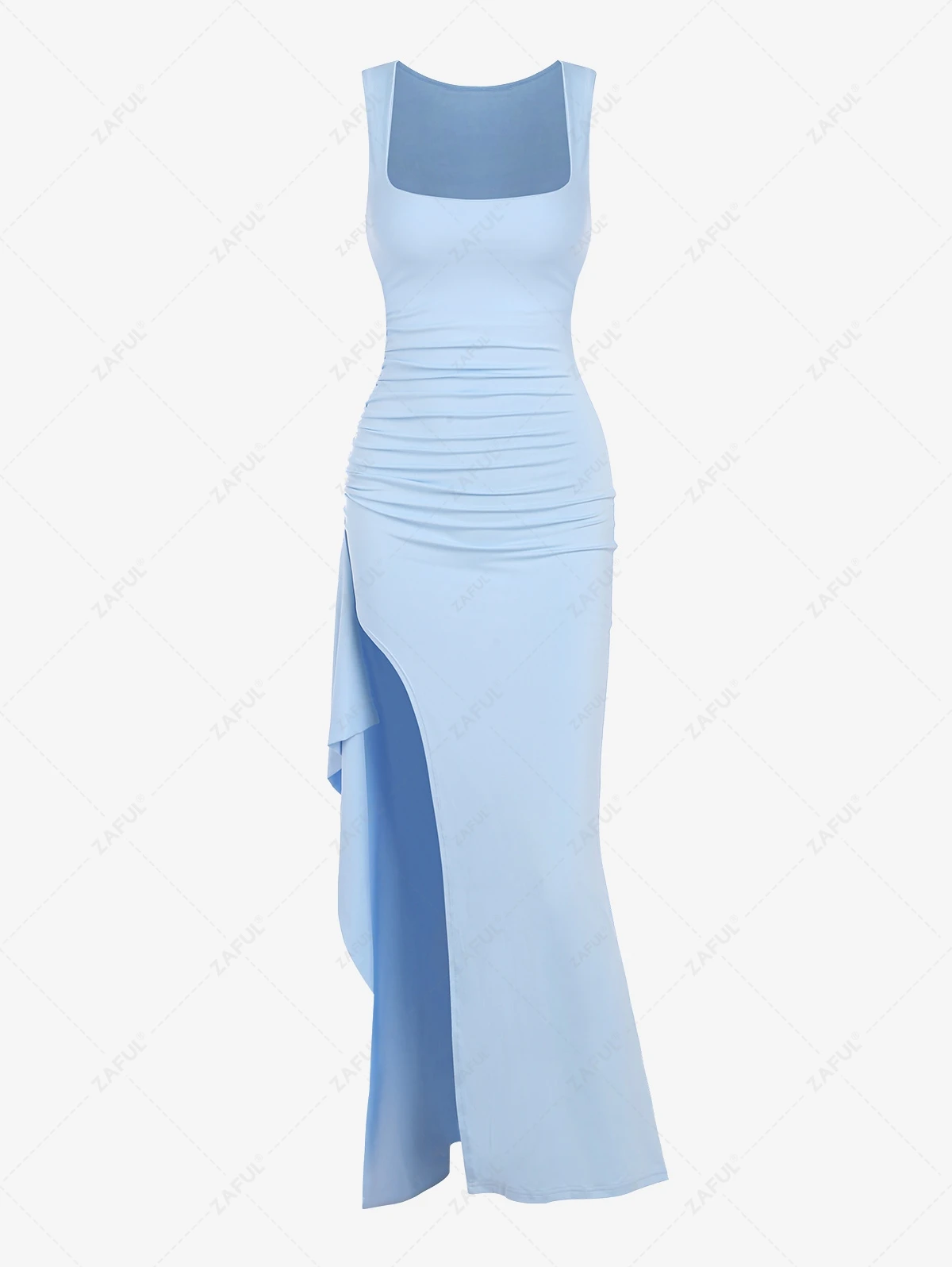 Women’s Sexy Elegant Solid Color Ruched Ruffle Draped Thigh High Split Maxi Dress