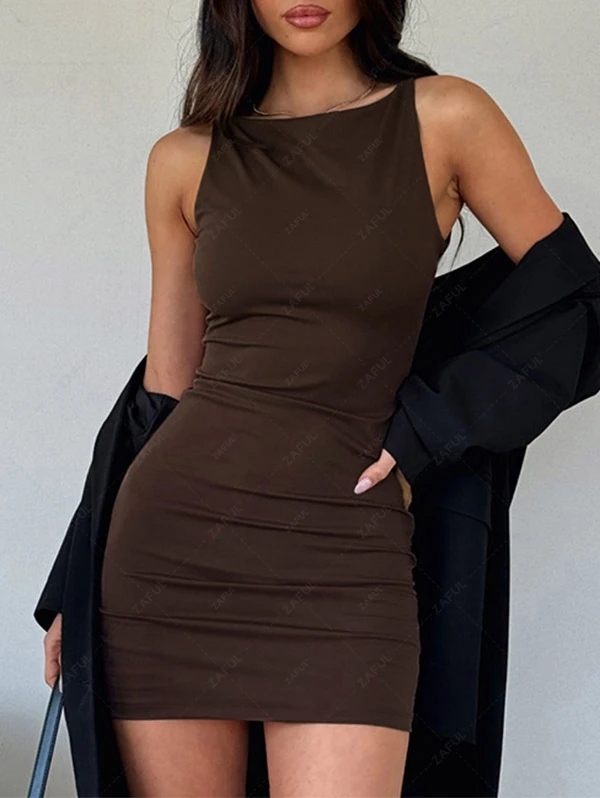 Women’s Plain Solid Color Crew Neck Sleeveless Slim Fit Mini Tank Dress