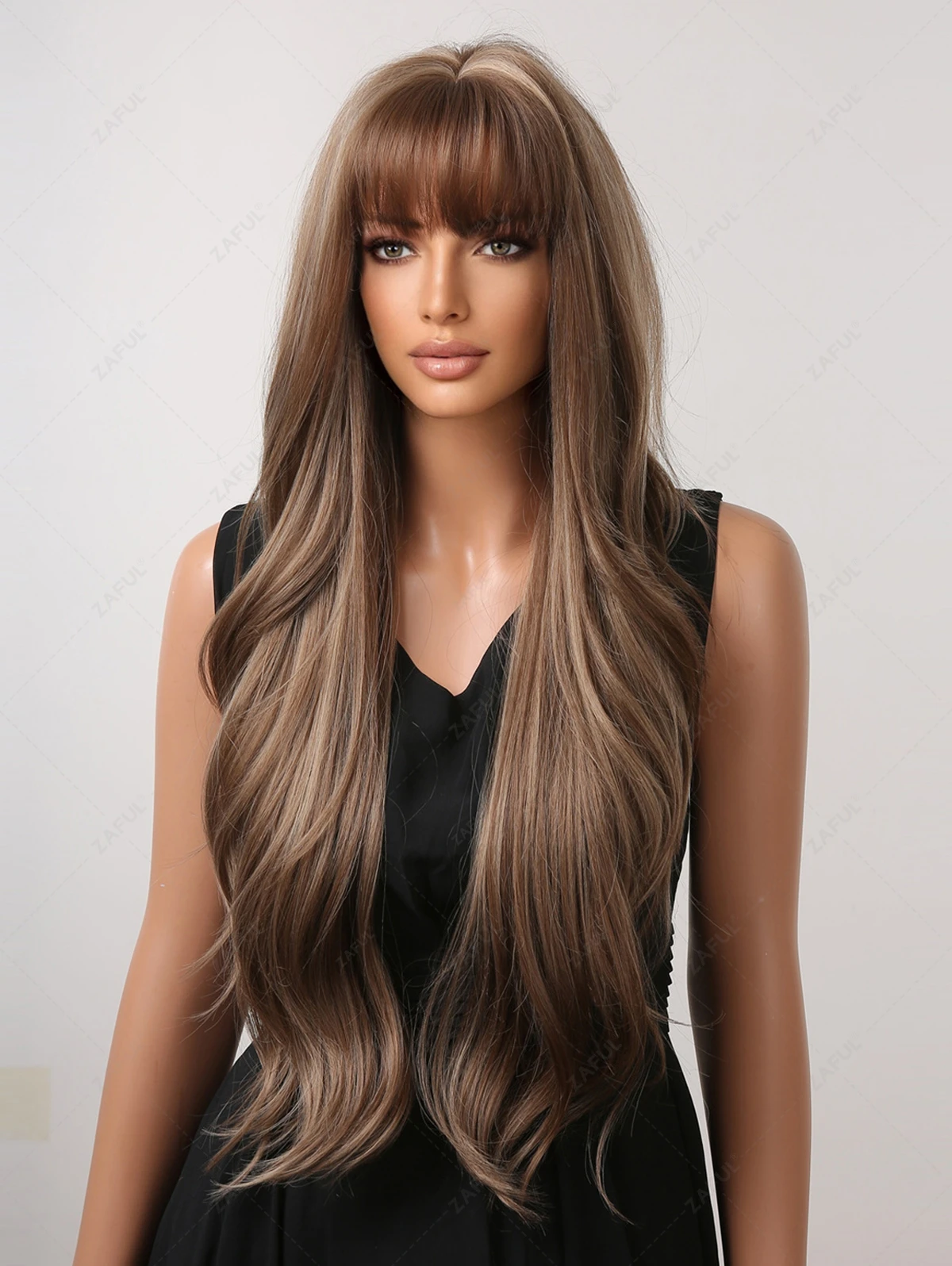 See-through Bangs Brown Gradient Light Brown Long Wavy Synthetic Wig