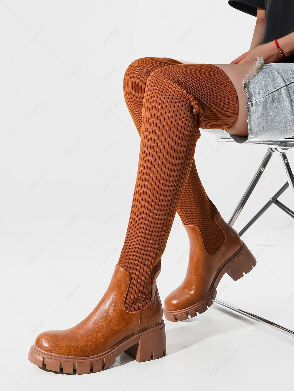 Women’s British Style Solid Color Over-the-knee Length Chunky Heel Stretchy Knitted Sock Boots