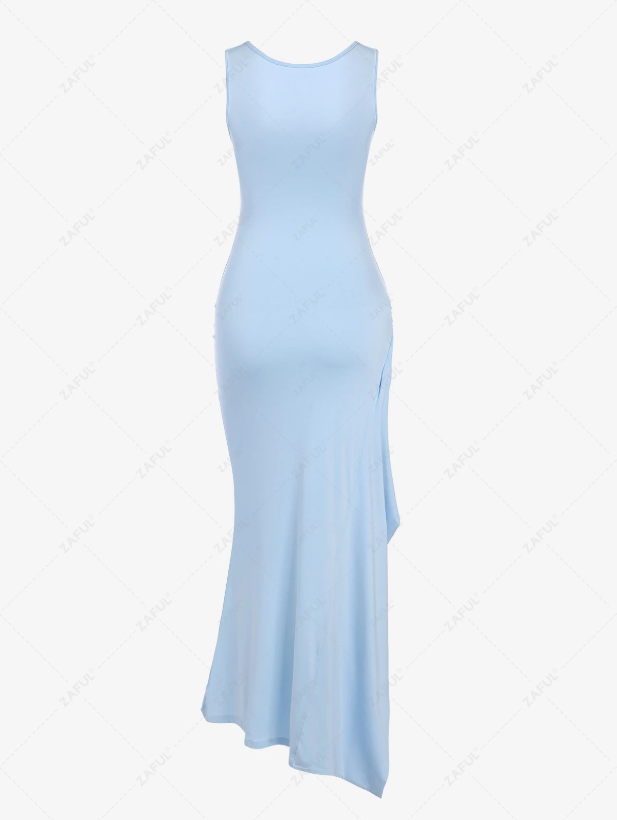 Women’s Sexy Elegant Solid Color Ruched Ruffle Draped Thigh High Split Maxi Dress